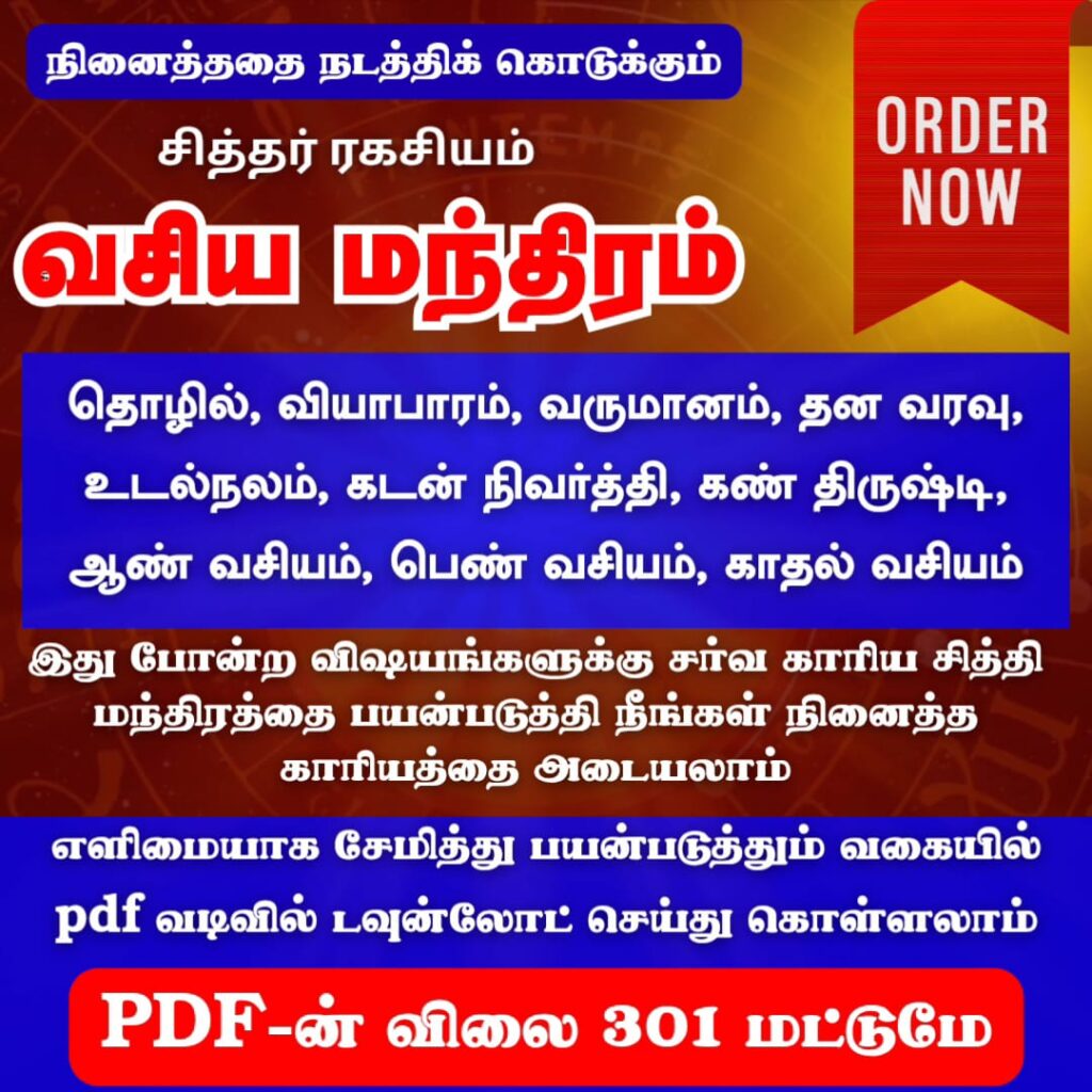 இப்பொழுதே இந்த வசிய மந்திர PDF வாங்க விரும்பும் நபர்கள் கீழே உள்ள படிவத்தில் பெயர் தொலைபேசி எண் WHATSAPP எண் போன்றவற்றை பூர்த்தி செய்து GPAY OR PHONE PAY மூலமாக கட்டணம் செலுத்திய உடன் உடனடியாக நாங்கள் உங்கள் WHATSAPP எண்ணிற்கு உங்களுடைய PDF அனுப்பி வைப்போம்